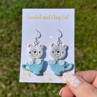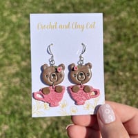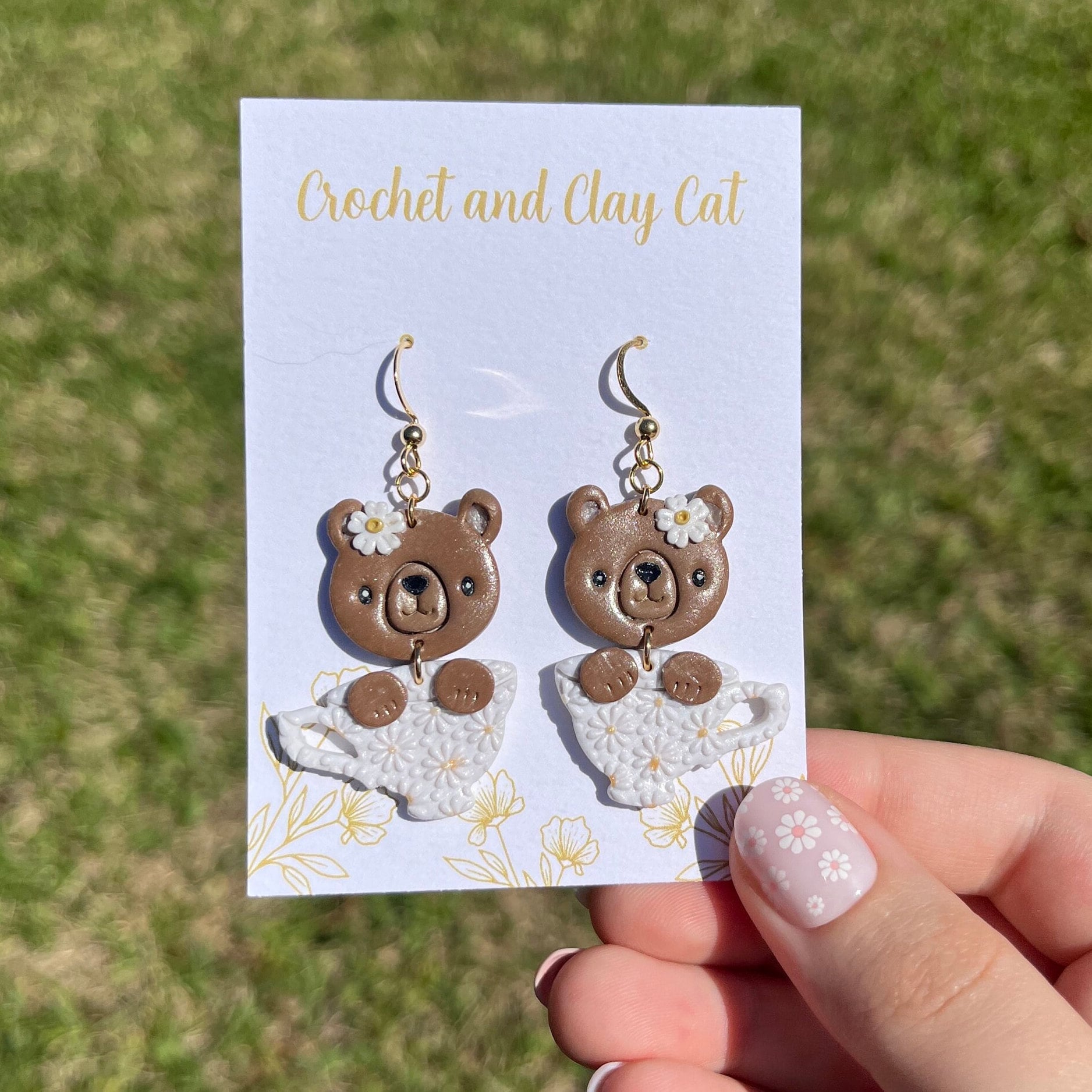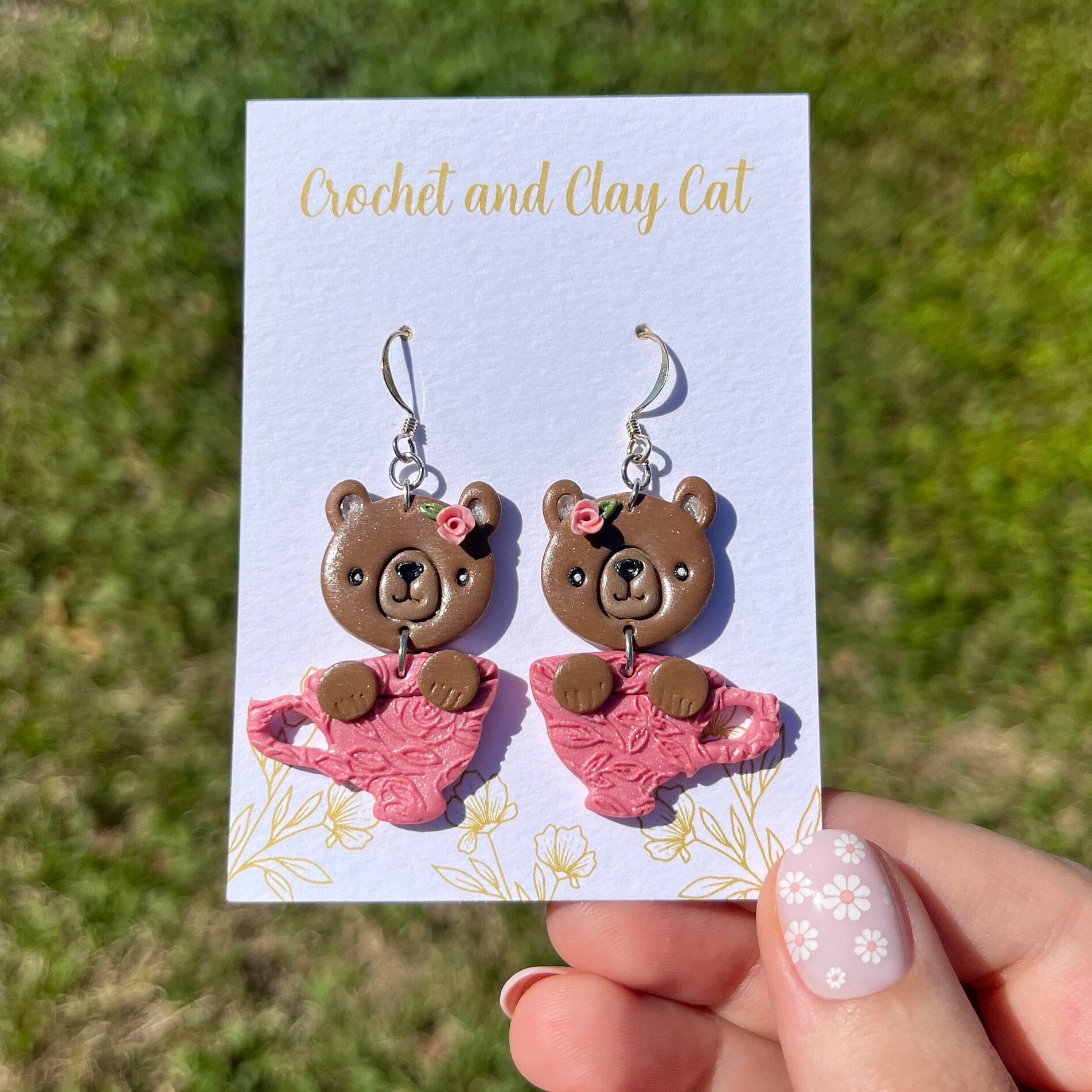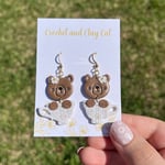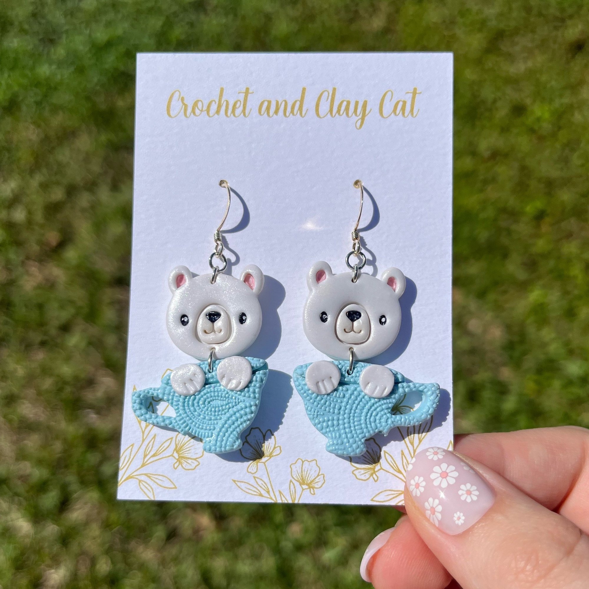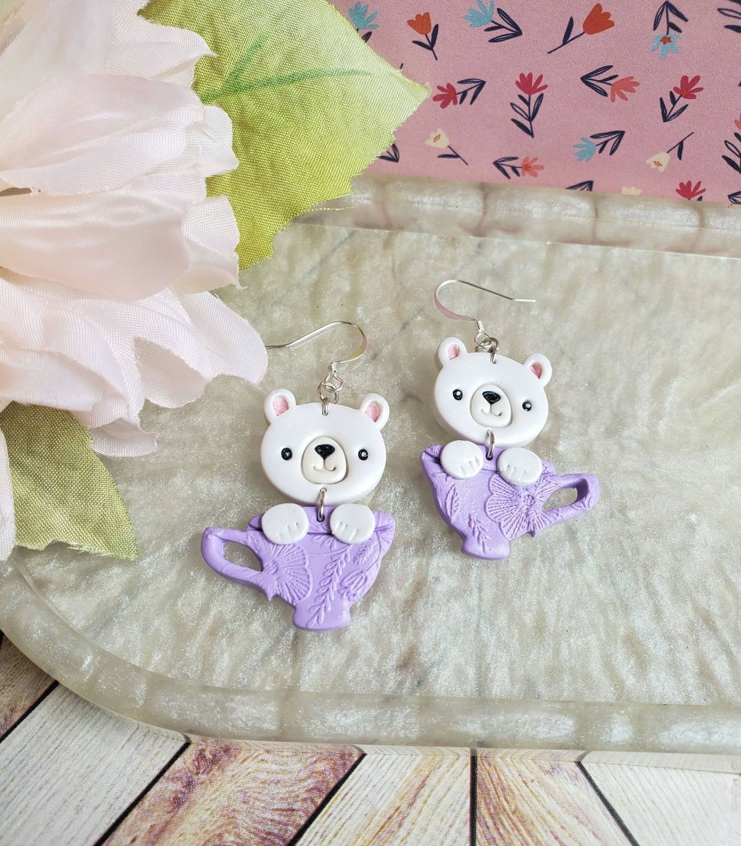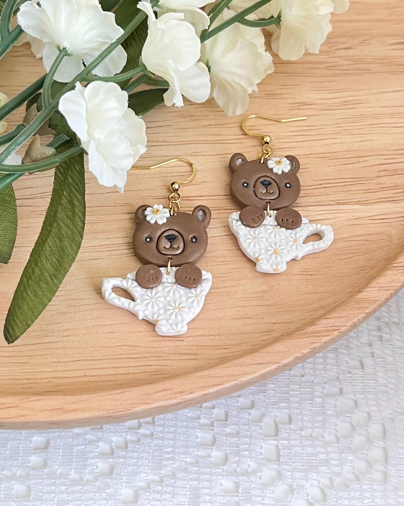Made from polymer clay, they feature a cute bear peeking out of a whimsical tea cup. The earrings are lightweight and easy to wear, making them perfect for any occasion.