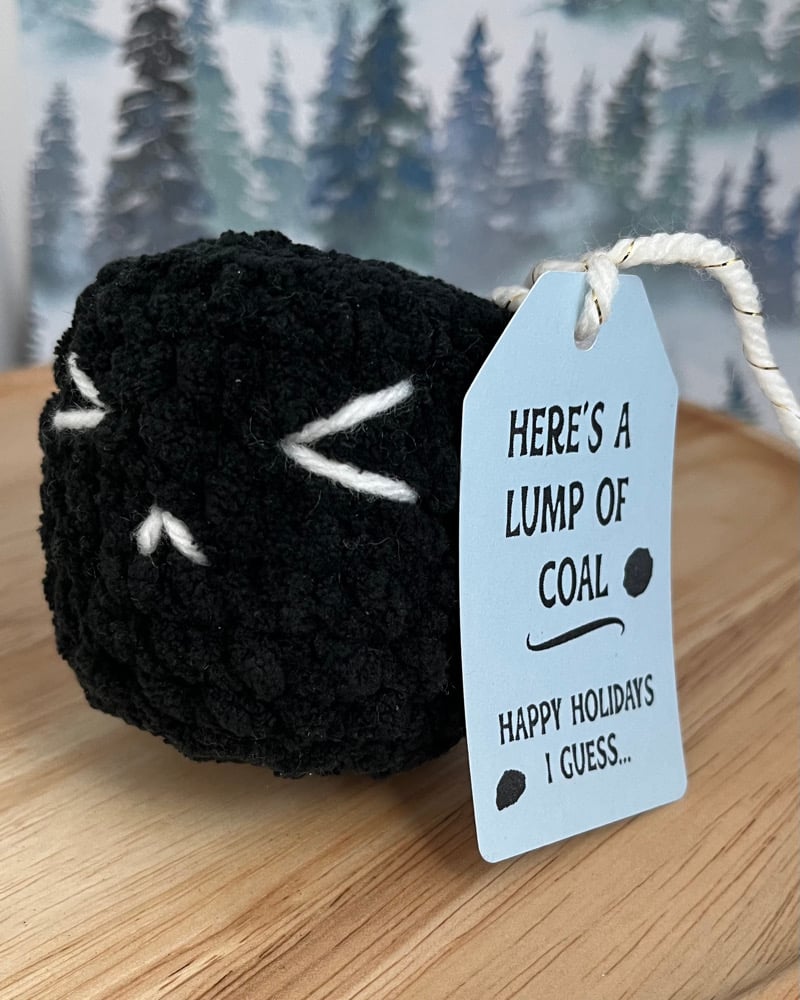 “Lump of Coal” burnt marshmallow plushies. Perfect for the holidays, these are the perfect gag gift that is actually useful! Make them laugh but also offer some stress support. A great pick for your favorite cousin, your brother in law you finger gun every holiday season, or yourself!