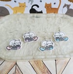 These adorable clay earrings feature white cats sitting on top of a stack of books with a mug completing the cozy vibe.
