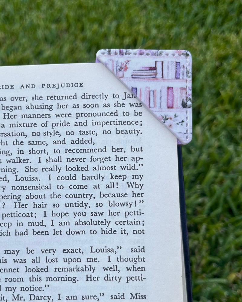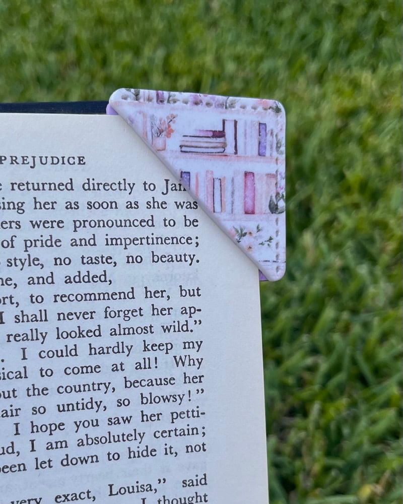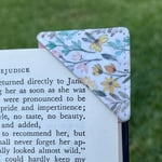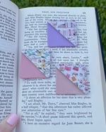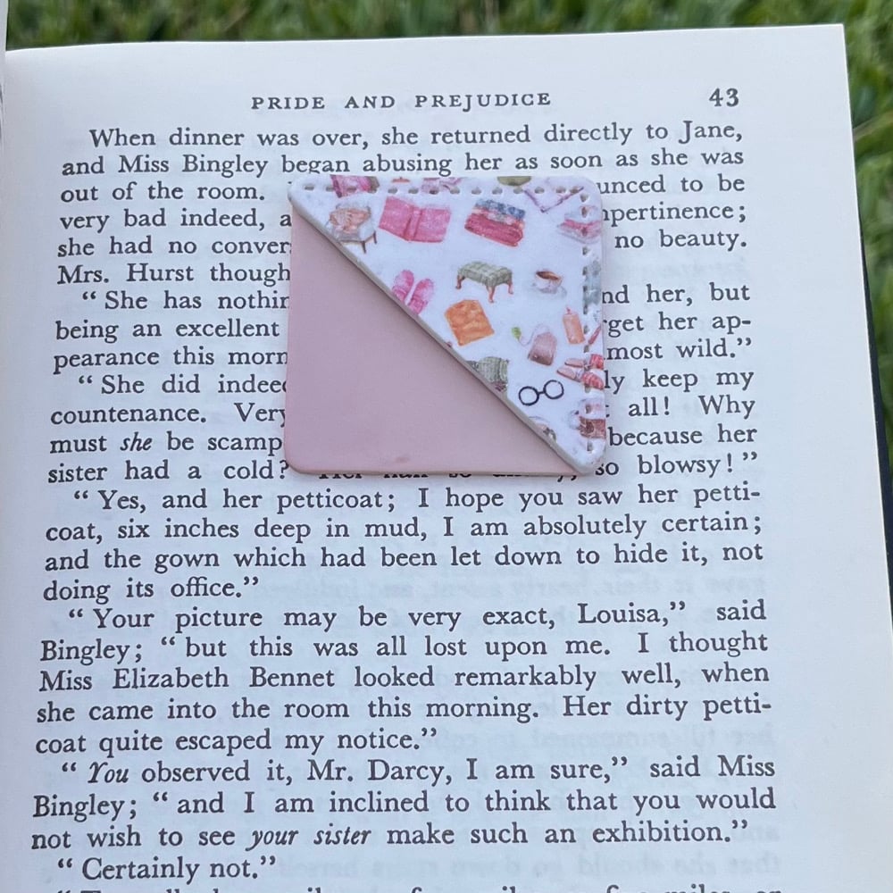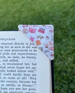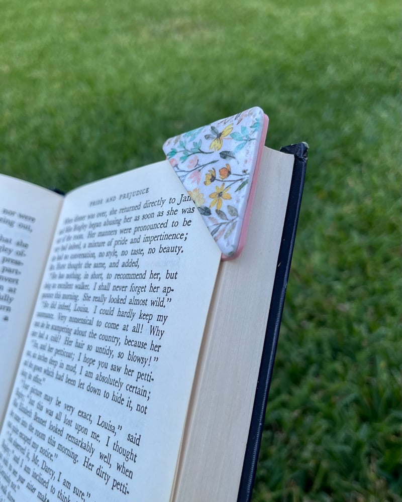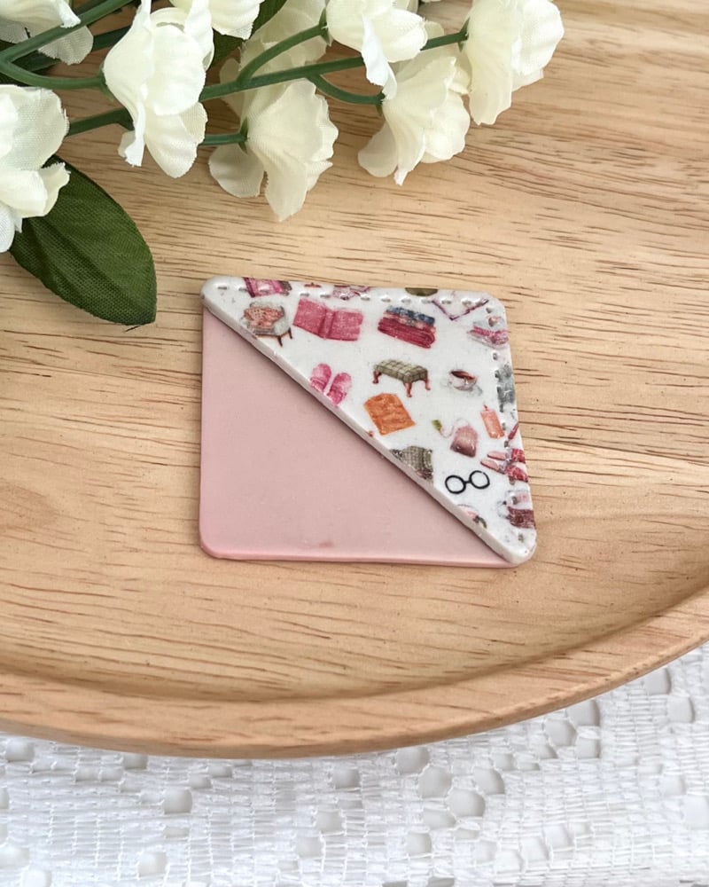 A fun twist on bookmarks! These corner bookmarks will keep your place by hugging the page you are on. Just slip it on the corner and you can give your eyes a rest before you doze off. Available in cute pastel colors with watercolor designs on top. Handmade out of polymer clay.
