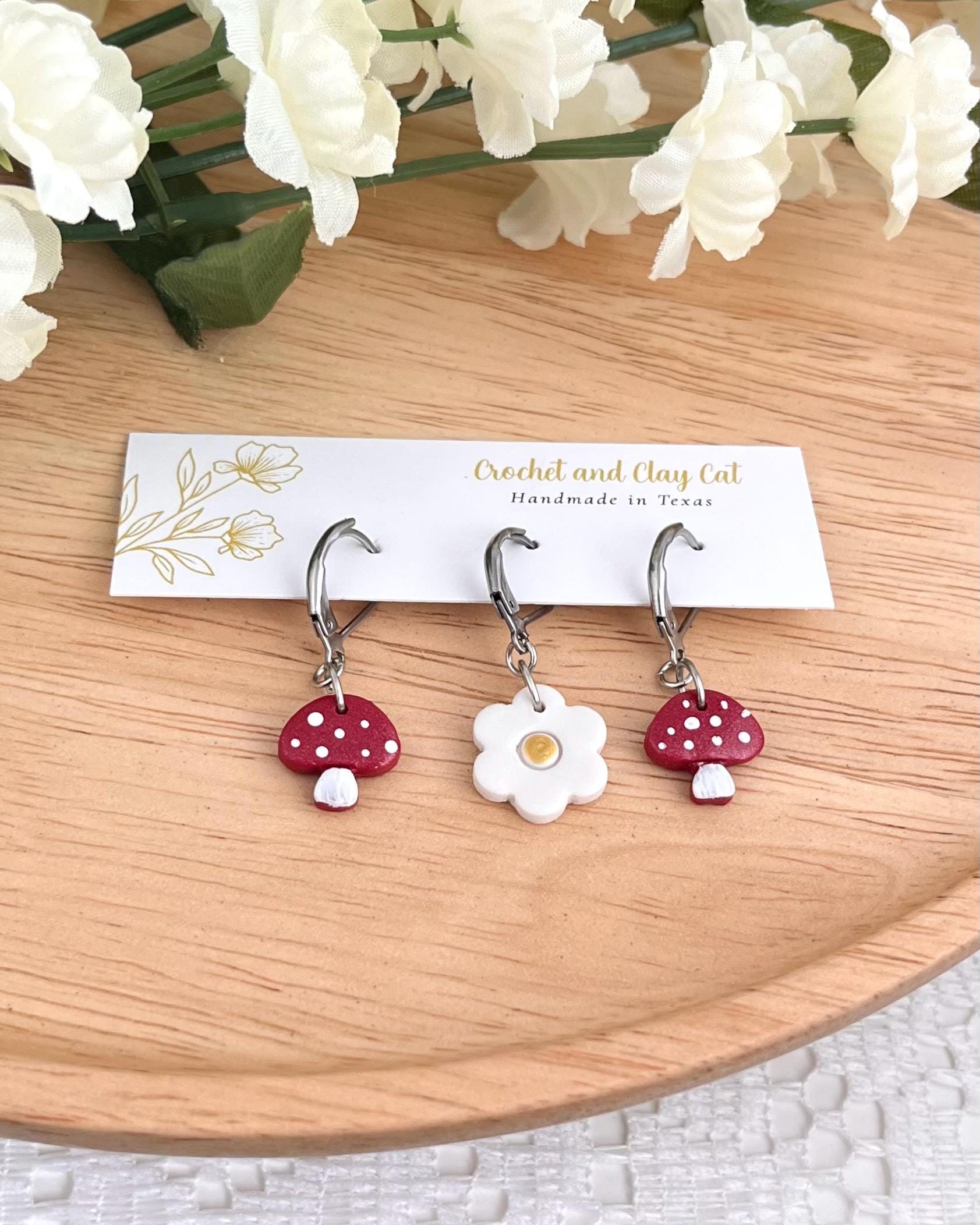 Adorable handmade stitch markers made with polymer clay and stainless steel leverback clips. These are the perfect gift for a fiber artist friend.
