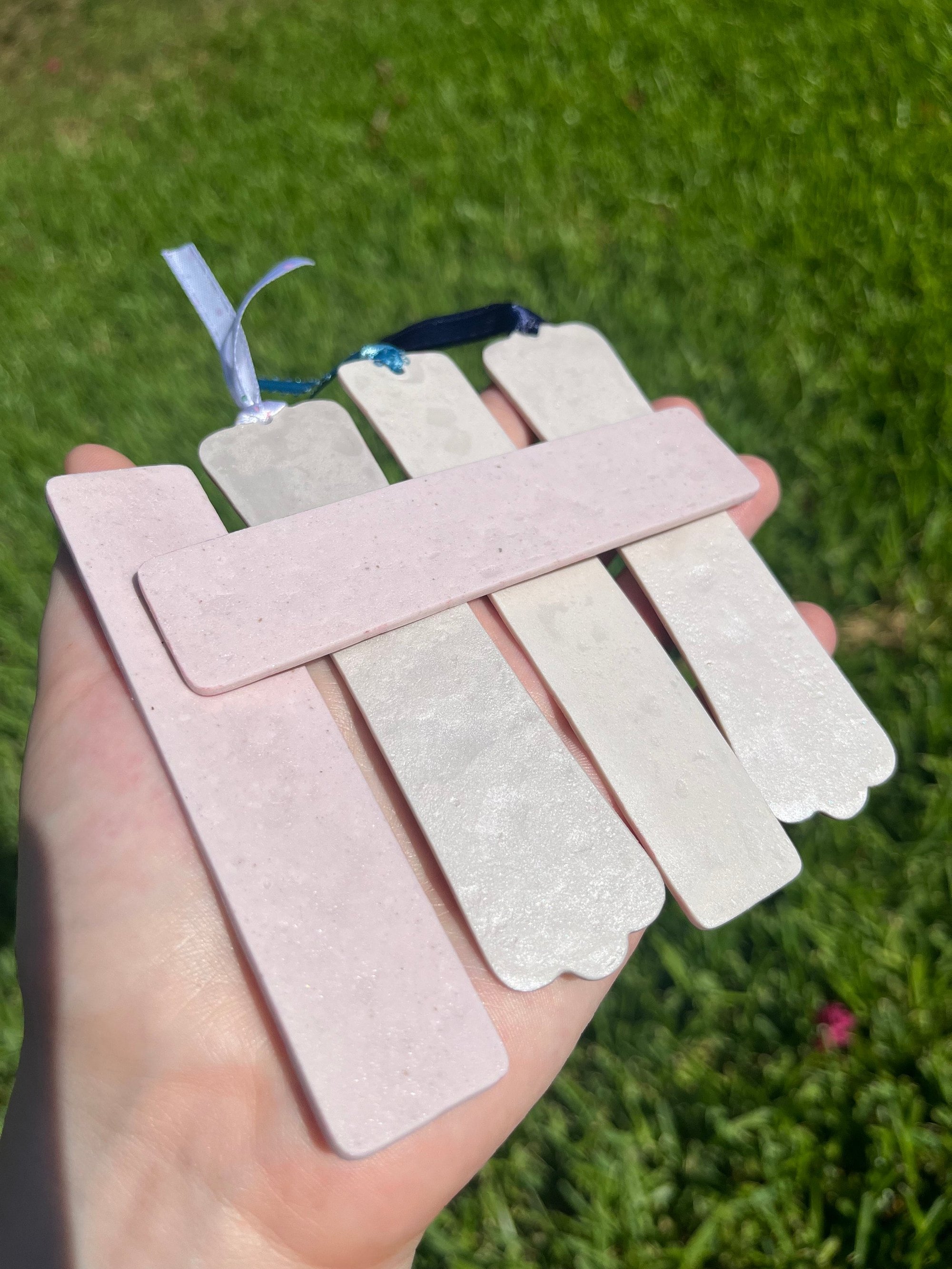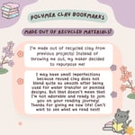 Who doesn't love being snuggled up with a book when it's cozy weather? These bookmarks are made out of polymer clay. These bookmarks are made entirely out of repurposed clay! I am on a mission to recycle supplies wherever possible. Because they are recycled from past projects where different materials and textures were used, the clay may have some small imperfections in texture or the patterns on the back. Despite this they are still super cute, and good for the environment since these materials were repurposed (yes even the ribbons used! They are from my grandmothers scrap collection)