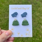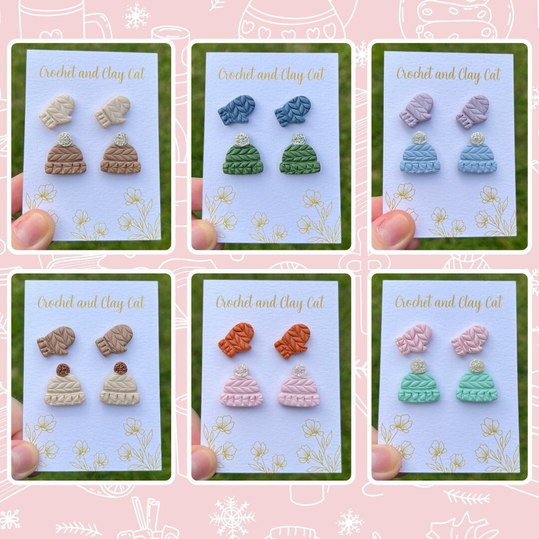 Adorable autumn themed stud earring packs. They have a cute knit pattern. These handmade earrings are made with polymer clay and nickel free metals for sensitive ears. Perfect for gifts! Available in a variety of colors, these earrings include one pair of mittens and one pair of snow hats.