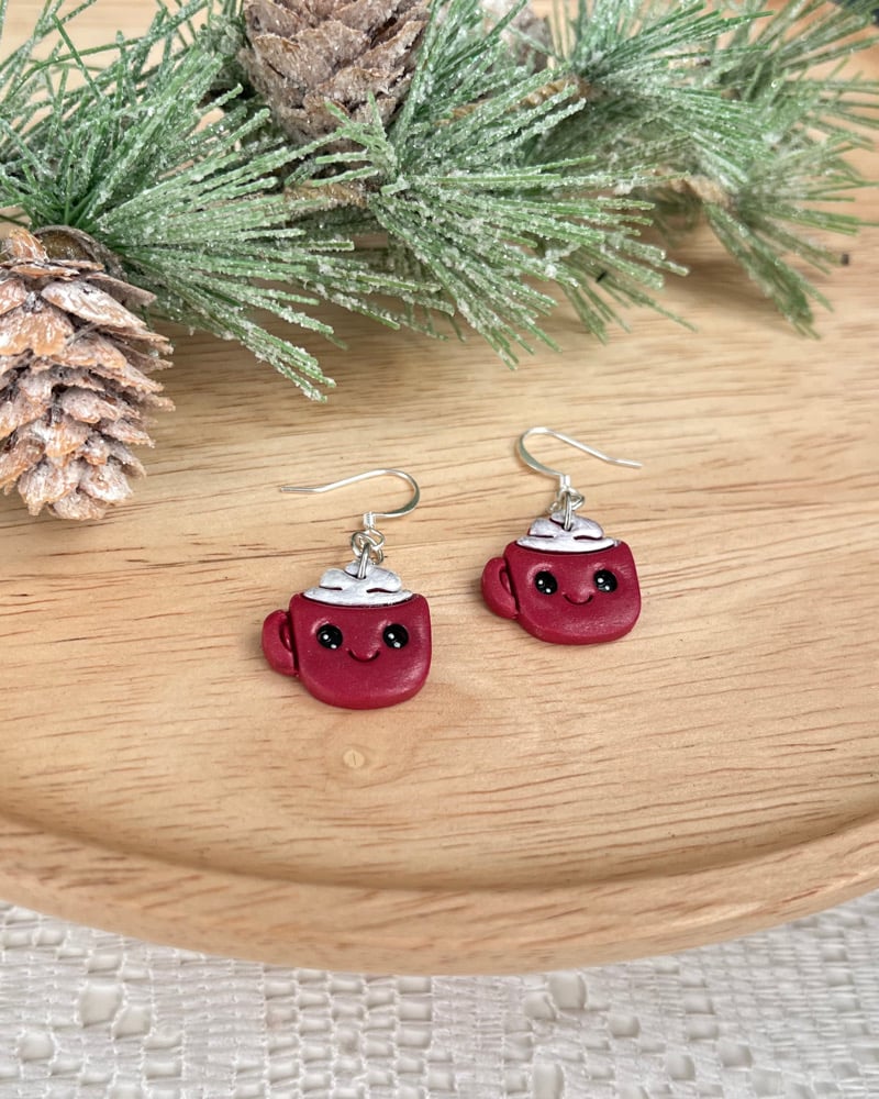 Put on your winter cozy vibes with these stunning peppermint mocha polymer clay dangly earrings. Handcrafted with care, these earrings feature adorable red mugs with whipped cream and adorable eyes. Made with lightweight and comfortable polymer clay, these earrings are perfect for daily wear or to add a touch of holiday cheer to any outfit. Whether you're attending a festival or simply want to embrace the cozy vibes of the season, these polymer clay earrings are the perfect accessory for any winter lover.