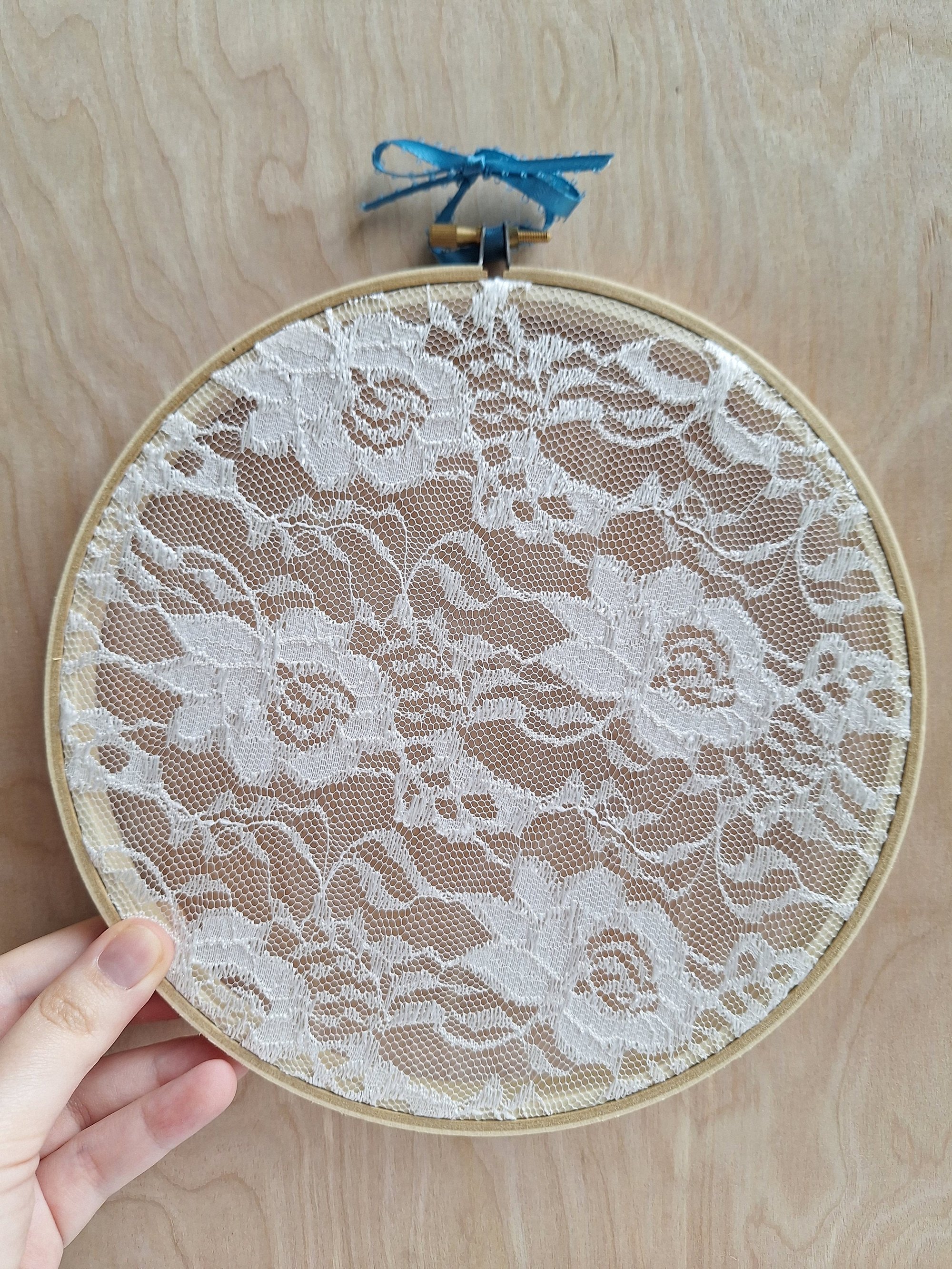 A lovely hand crafted wood and lace organizer to display and hang your jewelry. It is perfect for showcasing and storing earrings, pins, brooches, badges, hair pins, etc.