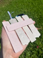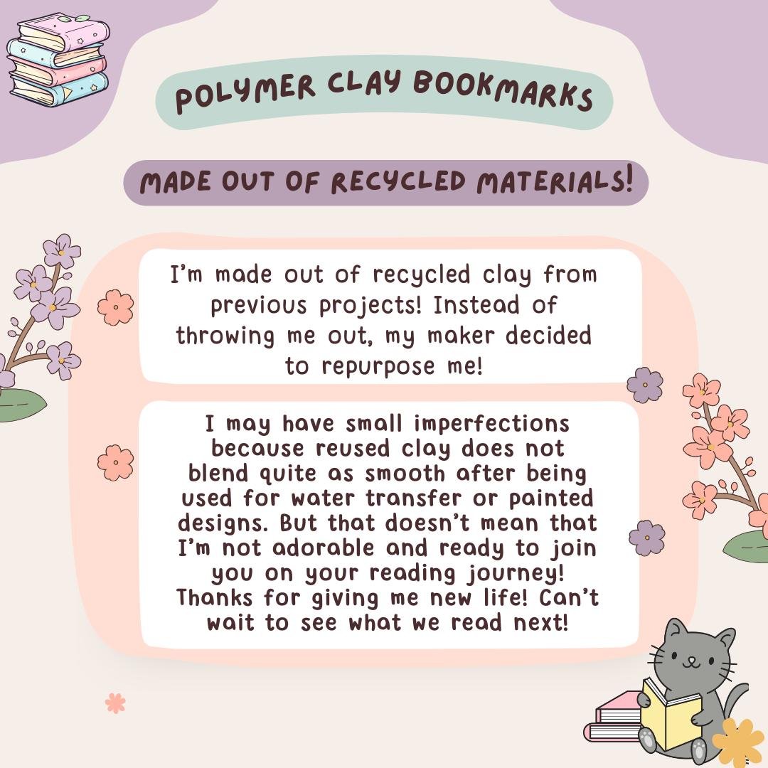 These bookmarks are made entirely out of repurposed clay! I am on a mission to recycle supplies wherever possible. Because they are recycled from past projects where different materials and textures were used, the clay may have some small imperfections in texture or the patterns on the back. Despite this they are still super cute, and good for the environment since these materials were repurposed (yes even the ribbons used! They are from my grandmothers scrap collection)