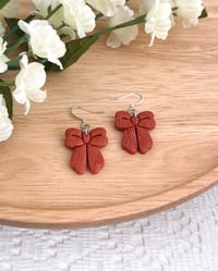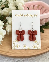 Cozy Sweater Vibes Alert! These earrings are the perfect way to welcome fall pumpkin spice, and everything nice! Adorable deep orange leaf patterned bow earrings. These handmade earrings are made with polymer clay and nickel free metals for sensitive ears.
