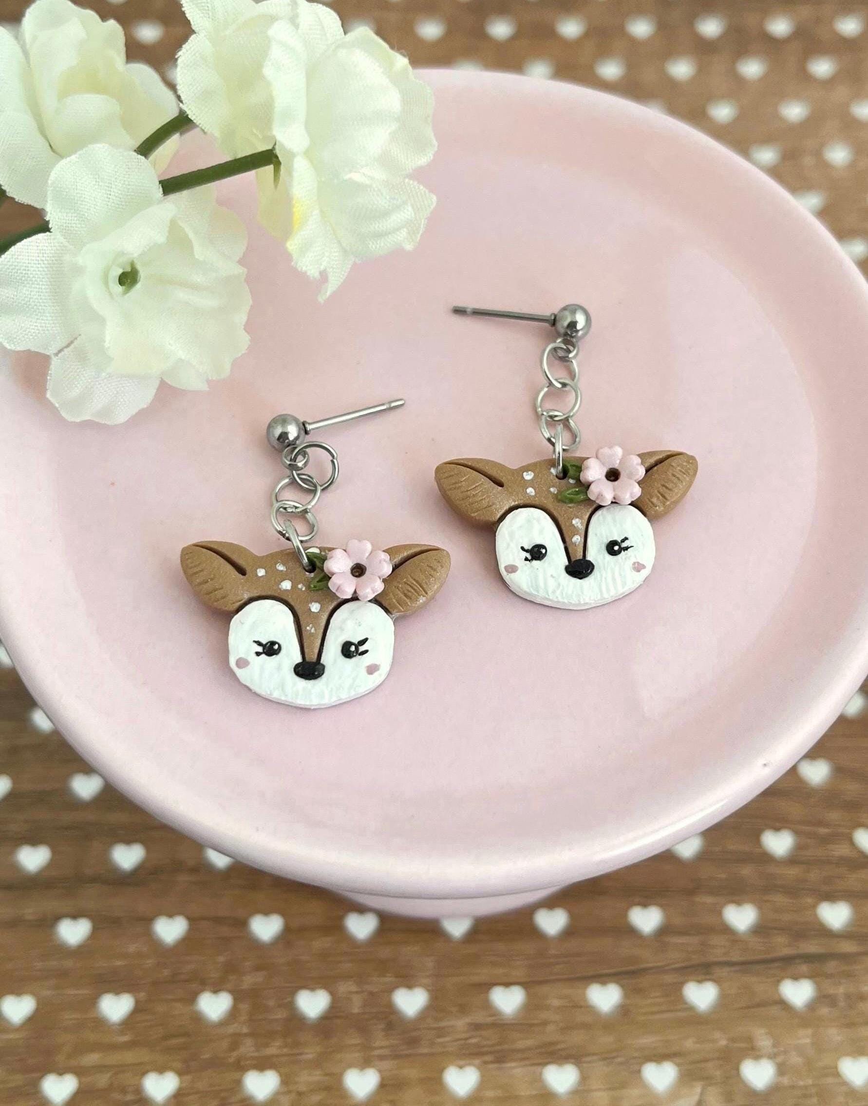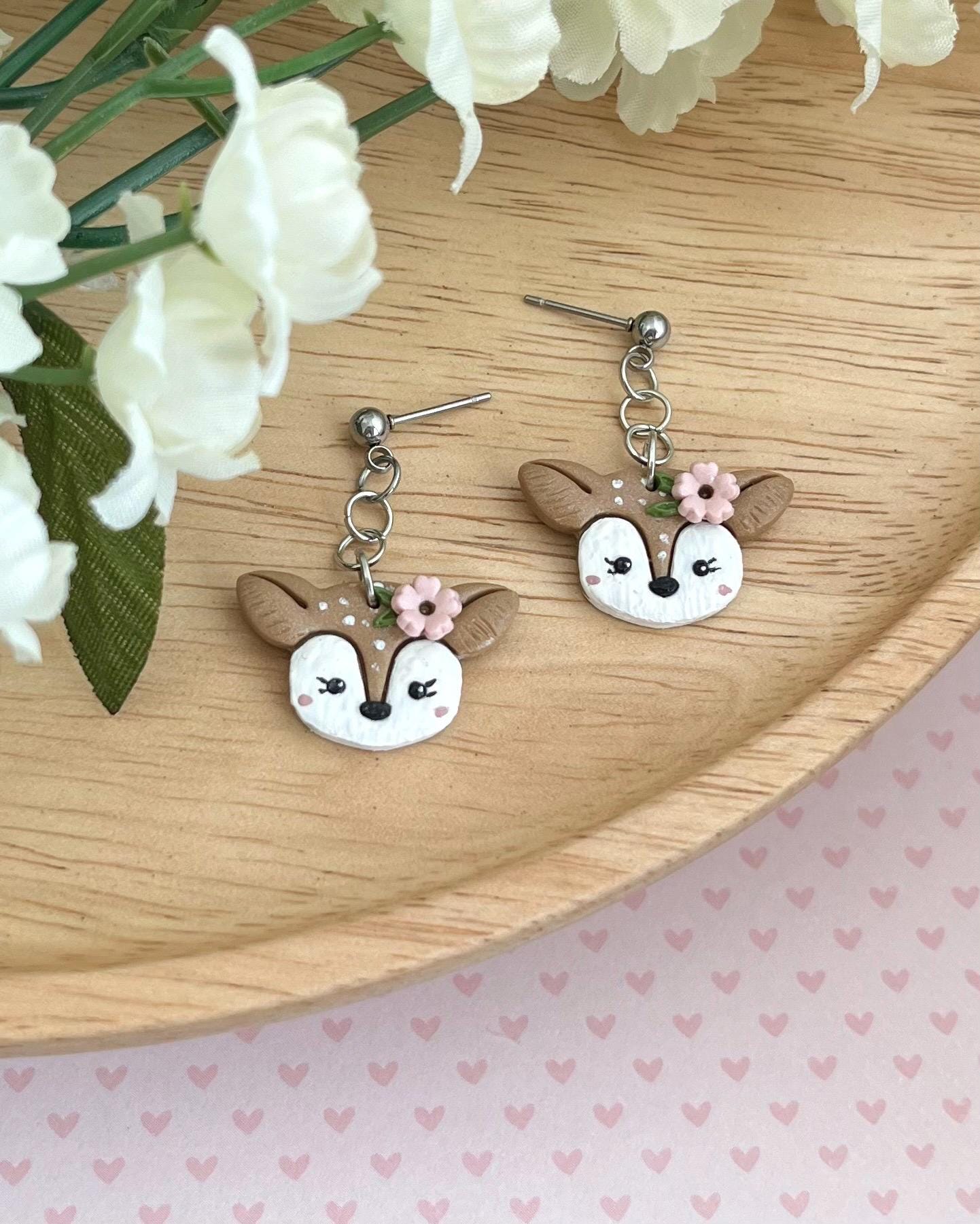 Adorable deer earrings for spring. These little fawns have the cutest little eyelashes and handpainted blush.