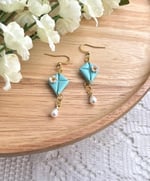 Bring on the carefree vibes with these nostalgic earrings. Adorable pastel kite earrings in pink and light teal, accented with daisies and pearls for the perfect blend of elegance and youth.