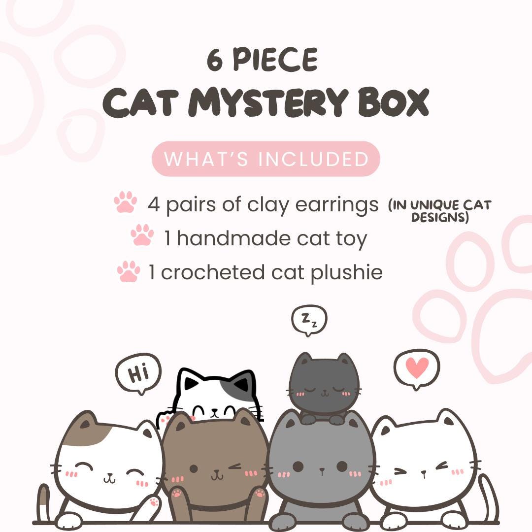 6 piece set ( 4 pairs of cat earrings, 1 handmade fish toy, 1 crocheted cat plushie)