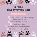 12 piece set ( 6 pairs of cat earrings, 2 fishie toys, 1 cat plushie, 1 cat charm, 1 crocheted bag)