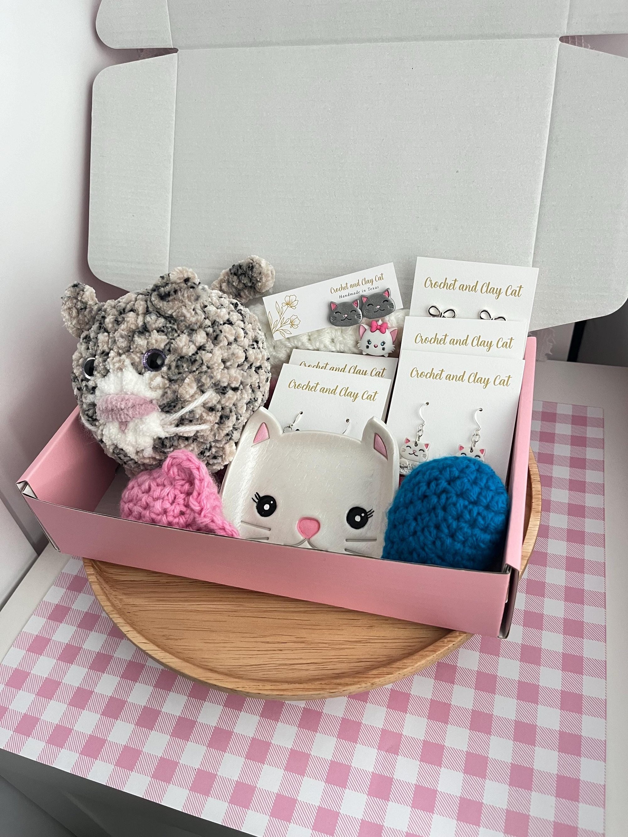 These adorable gift baskets are full of cat goodies! There are handmade clay earrings, crocheted cat toys and plushies, jewelry dishes, and crocheted bags— all made with cats and their owners in mind!