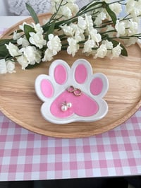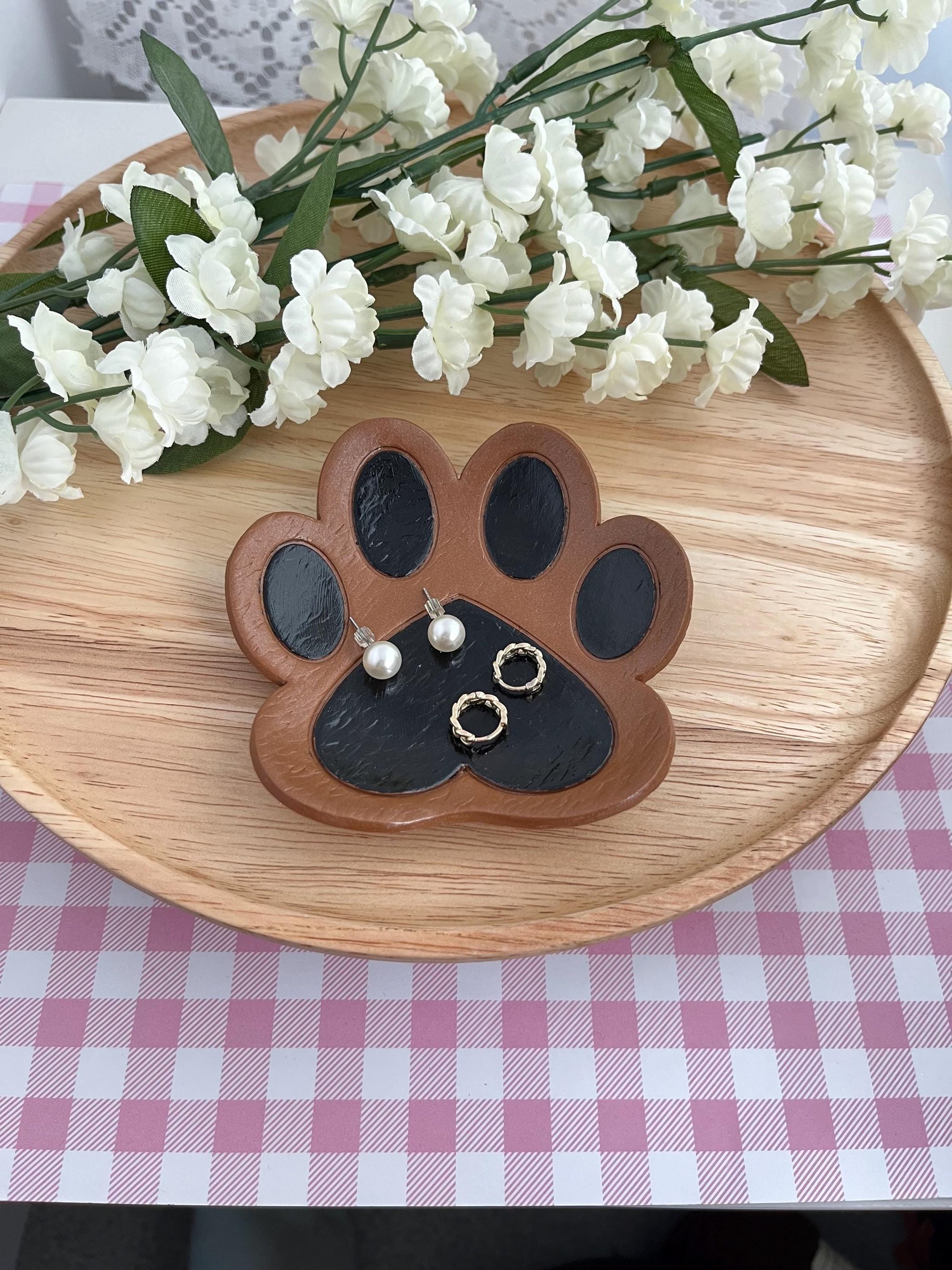 Introducing these cute pet jewelry dishes, the purr-fect addition to your vanity or dresser! Handcrafted with love, this polymer clay dish features intricate details of a paw print. Its design provides dainty room for your favorite earrings, rings, and trinkets, keeping them organized and easily accessible. The glossy finish adds a touch of elegance, making it not only a functional but also a beautiful piece of art that will enhance any space. This pet themed jewelry dish is a delightful gift for an animal lover or a treat for yourself - get ready to showcase your accessories in style!