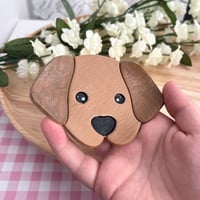 Each one is made by hand and turns out slightly different in size and style, but they measure roughly 4 inches wide for the paw prints and 3.5 inches wide for the puppy head.