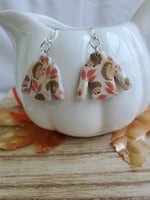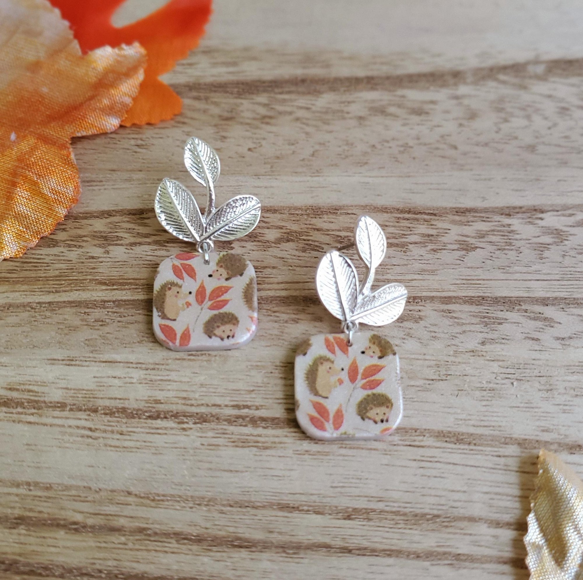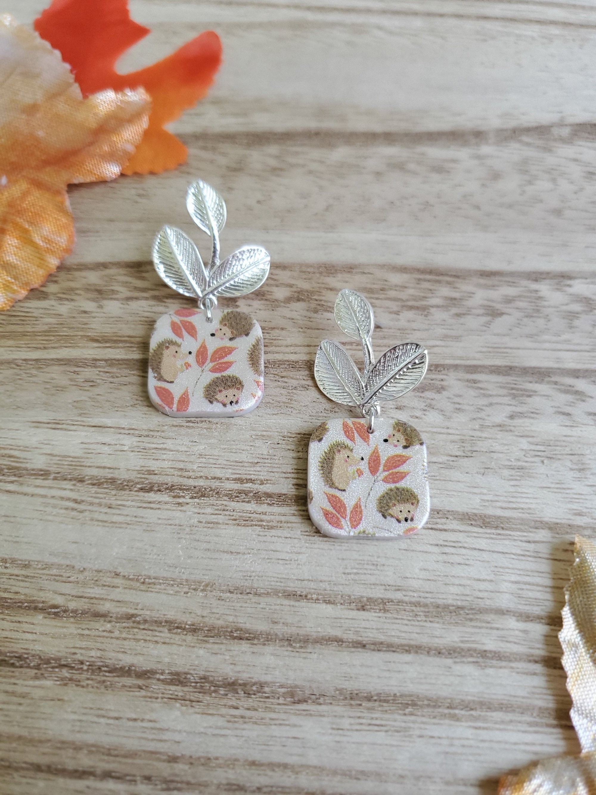 Fall in love with autumn with these adorable hedgehogs playing in leaves patterned polymer clay earrings. Handcrafted with care, these are made with lightweight and comfortable polymer clay. These earrings are perfect for daily wear or to add a touch of autumn charm to any outfit. Whether you're attending a fall festival or simply want to embrace the cozy vibes of the season, these fall-themed polymer clay earrings are the perfect accessory for any fall lover.Adorable handmade earrings made with polymer clay and nickel free hypoallergenic metals for sensitive ears. These earrings are perfect for a gift!