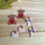 Enjoy the nostalgia of these Kidcore themed earrings. Featuring favorites from your childhood, these earrings are the perfect birthday gift. Choose between old fashioned teddy bears holding red hearts, pink frosted strawberry cakes, or a colorful bunch of balloons. Adorable handmade earrings made with polymer clay and nickel free metals for sensitive ears.
