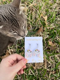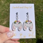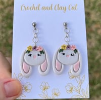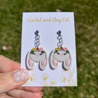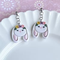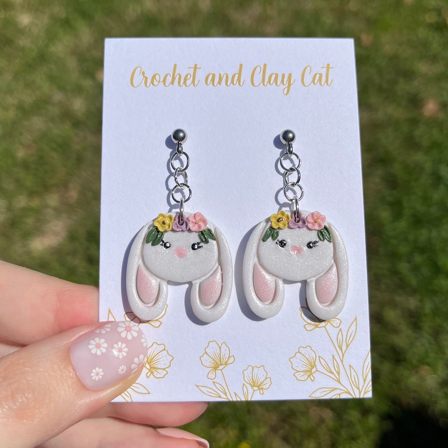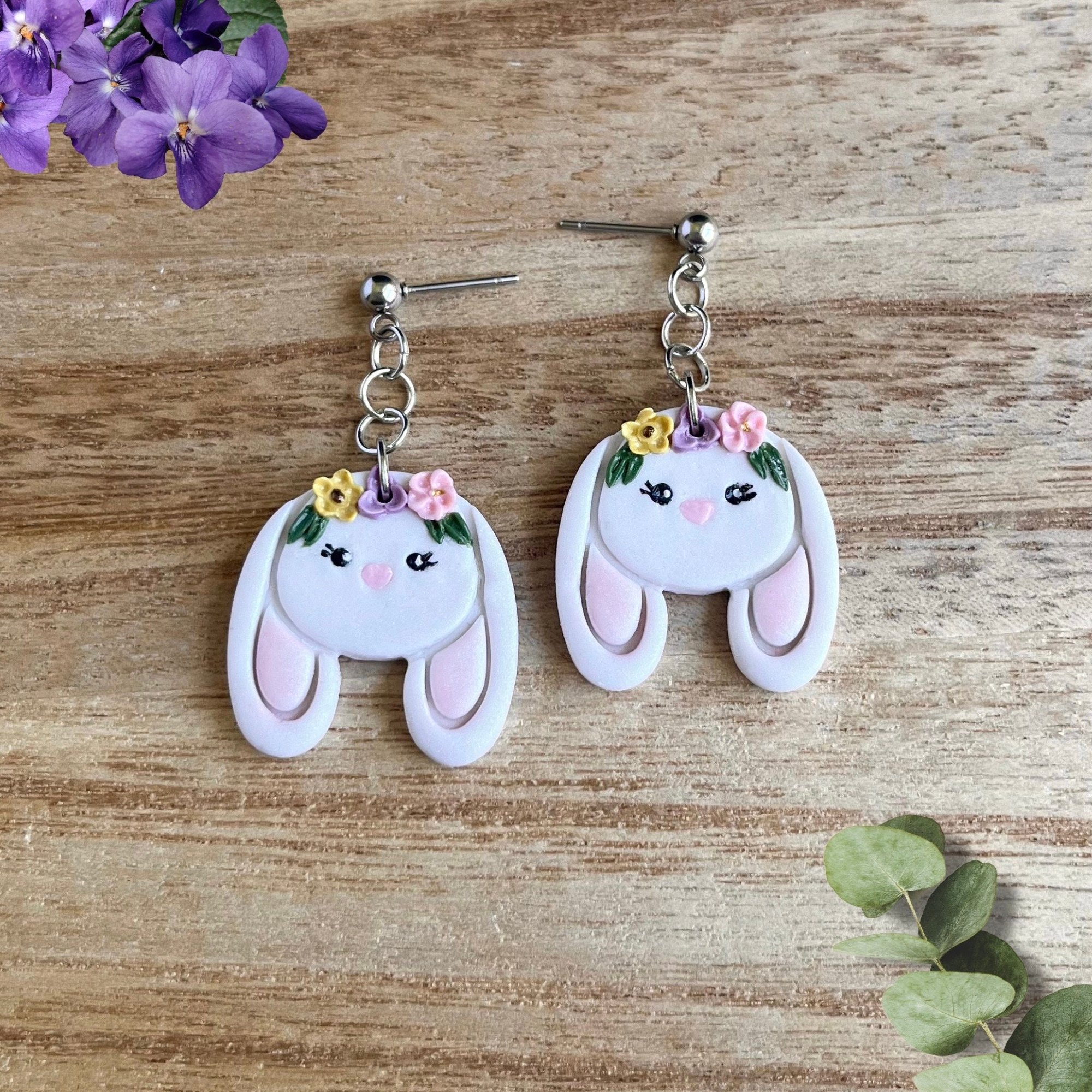 Adorable lop bunny earrings! These bunnies are perfect for spring complete with flower crowns. The very essence of cottagecore fashion, these are handmade with precision and care, each earring features a cute white rabbit design that is sure to turn heads.