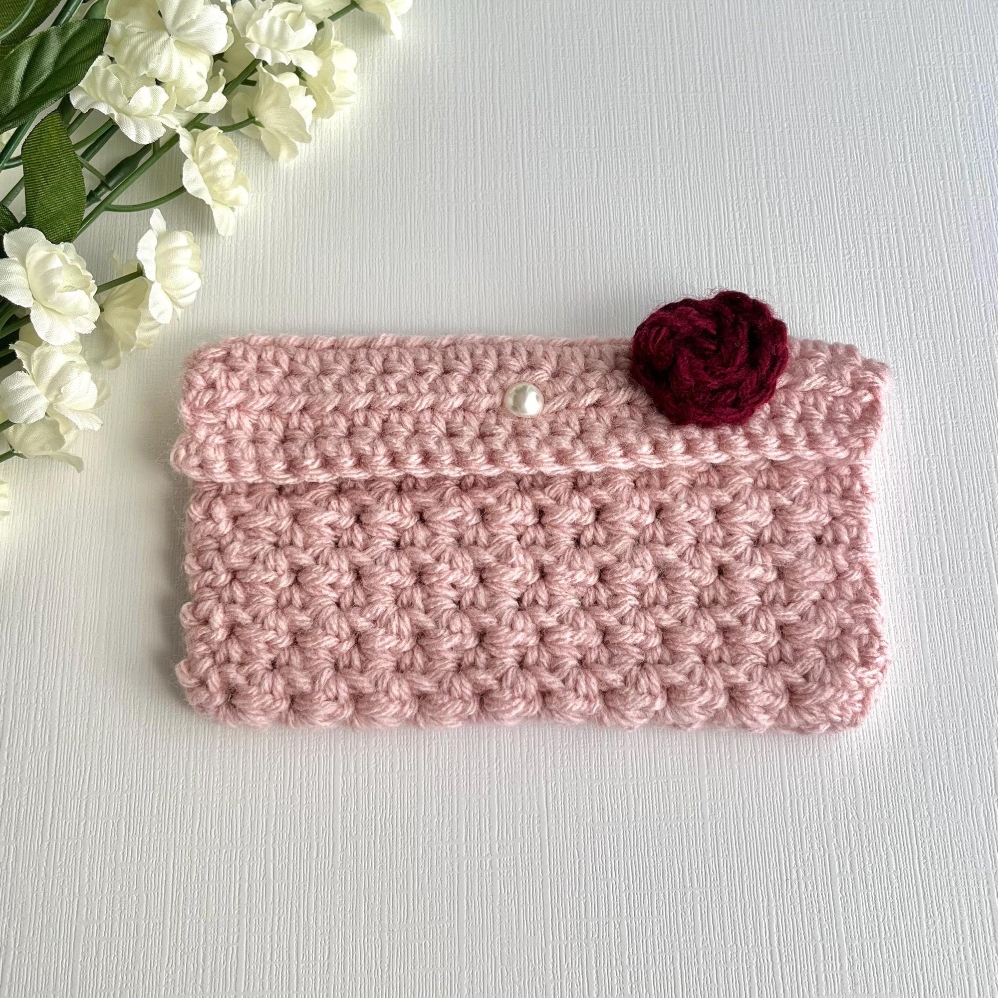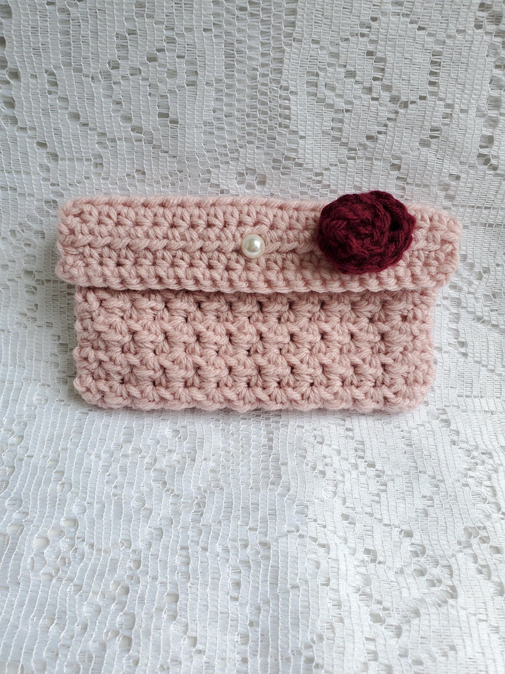 Pink Rose Clutch - Crochet Bag - Gift Card Pouch - Handmade Wallet