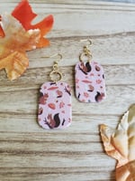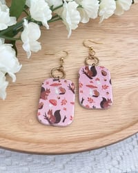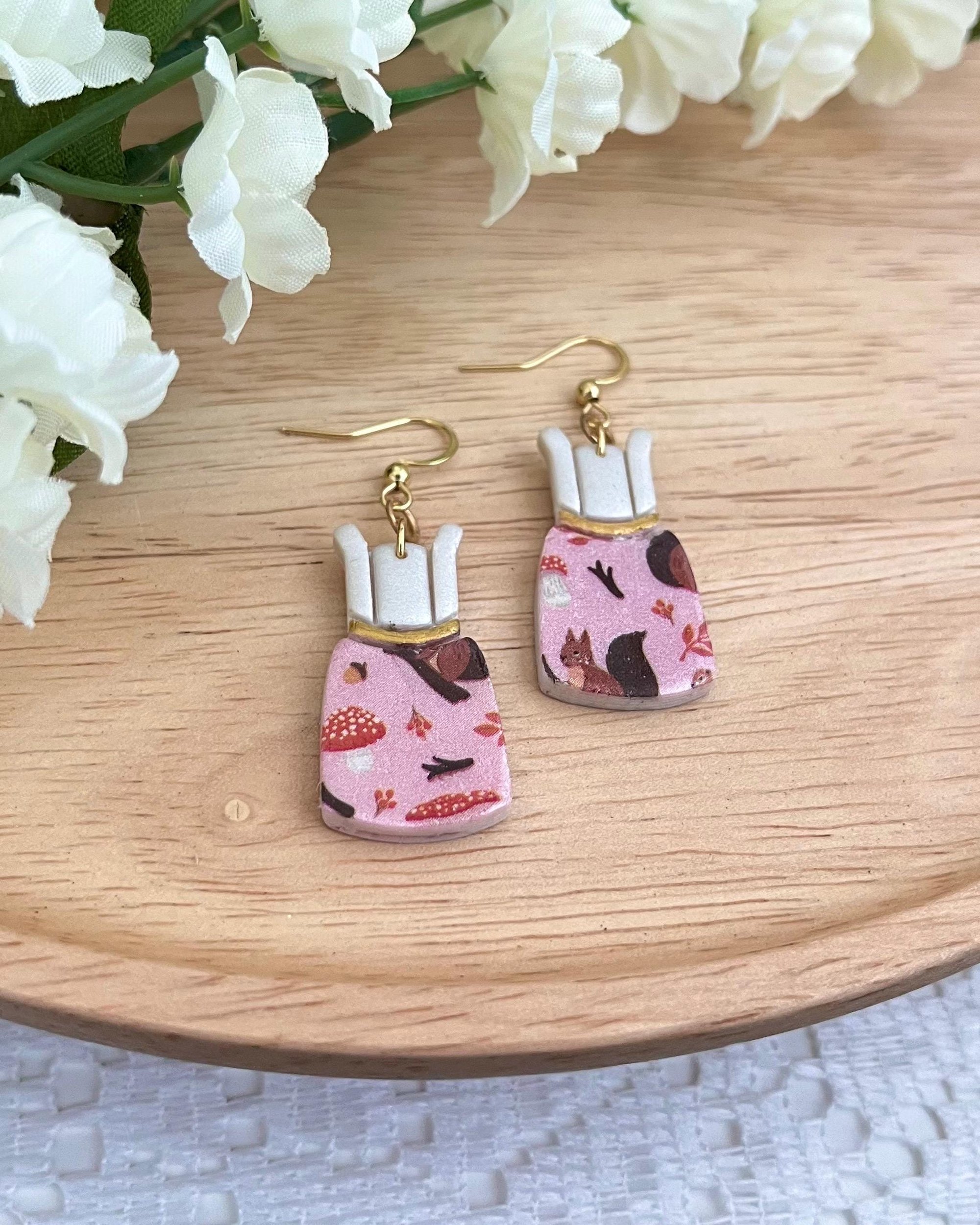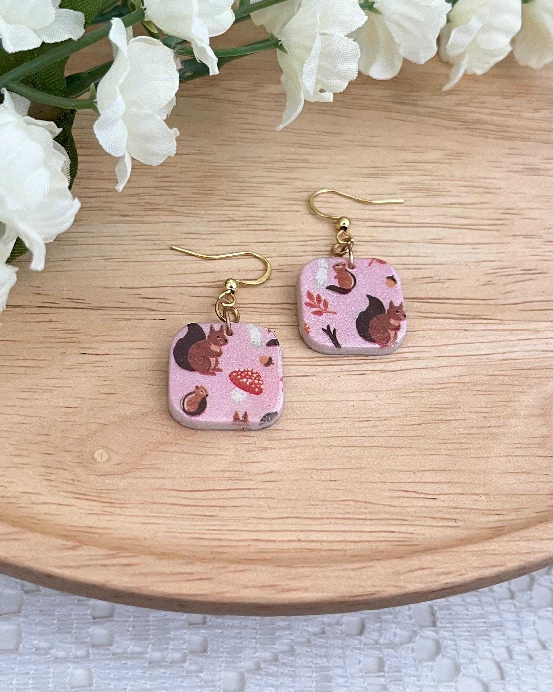 Fall into style with these adorable squirrel patterned polymer clay earrings. The shiny pink bases have cute squirrels, leaves and mushrooms on them. Made with lightweight and comfortable polymer clay, these earrings are perfect for daily wear or to add a touch of autumn charm to any outfit. Whether you gift them to a loved one or treat yourself, these earrings are sure to make a stylish statement this season.