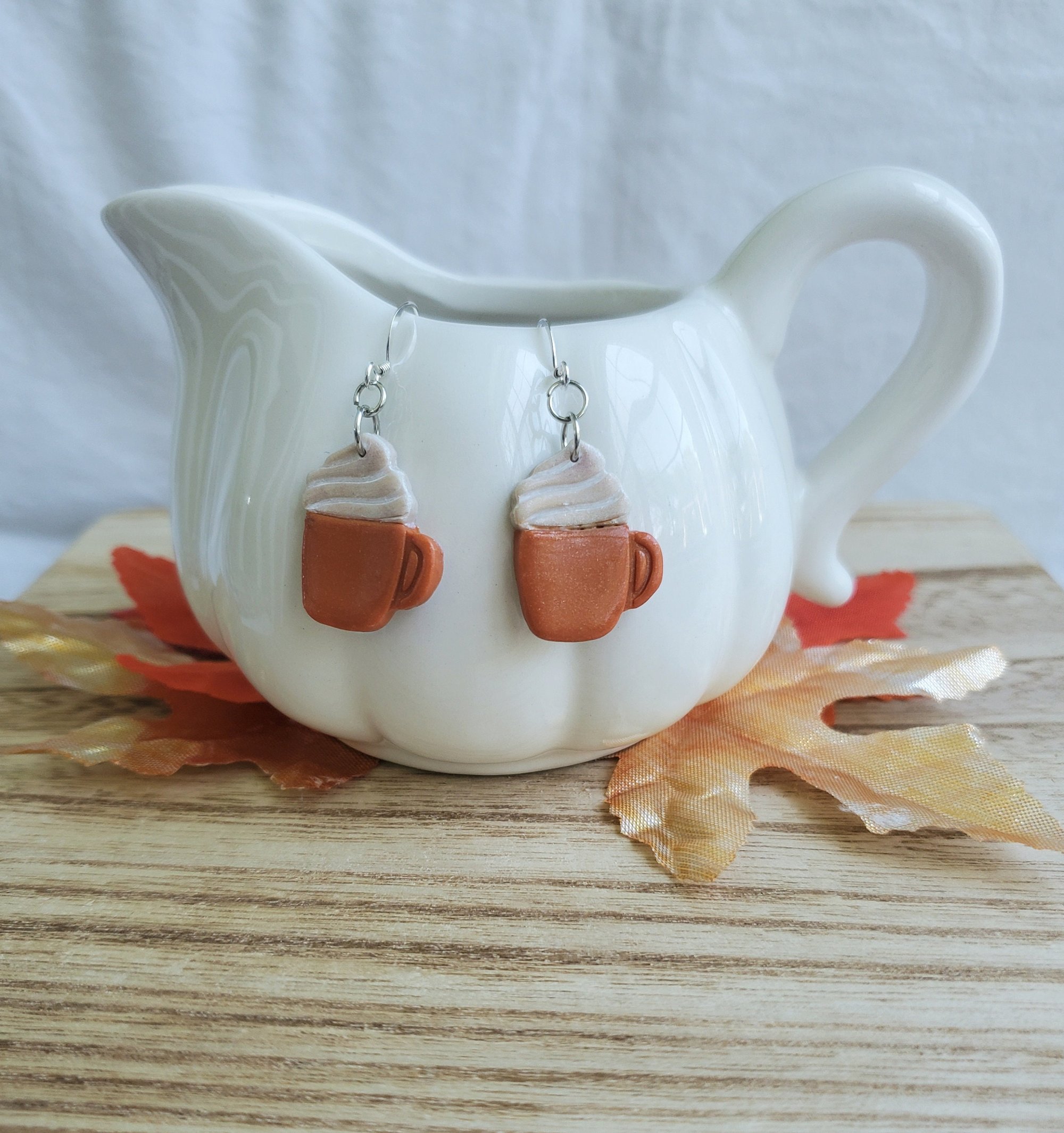 Fall into style with these pumpkin spice latte polymer clay dangly earrings. Handcrafted with care, these earrings feature adorable orange mugs with whipped cream on top. Made with lightweight and comfortable polymer clay, these earrings are perfect for daily wear or to add a touch of autumn charm to any outfit.