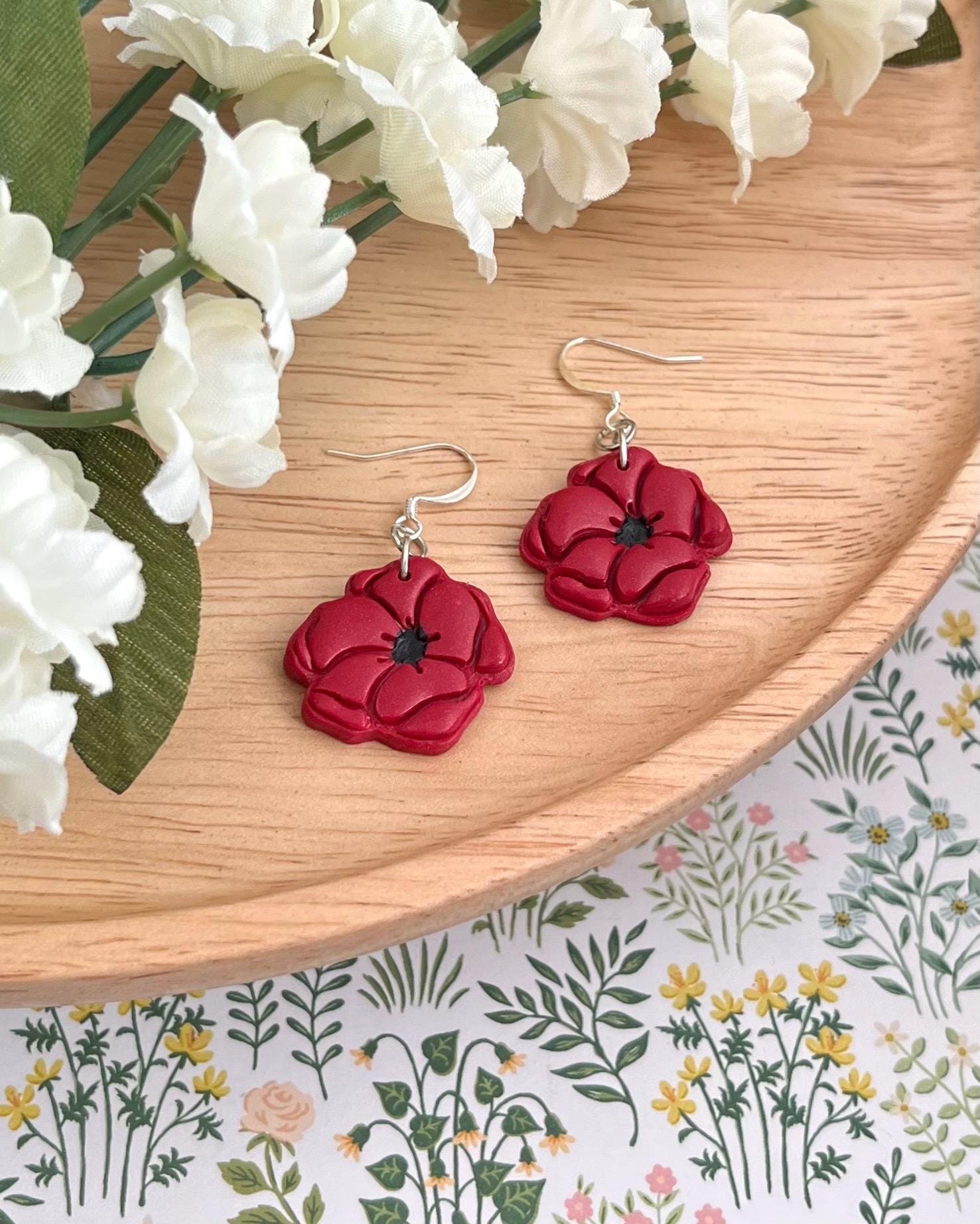 Red Poppy Flower Clay Statement Earrings
