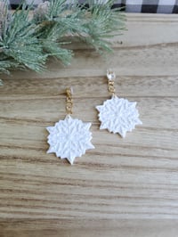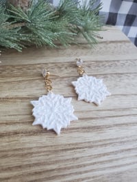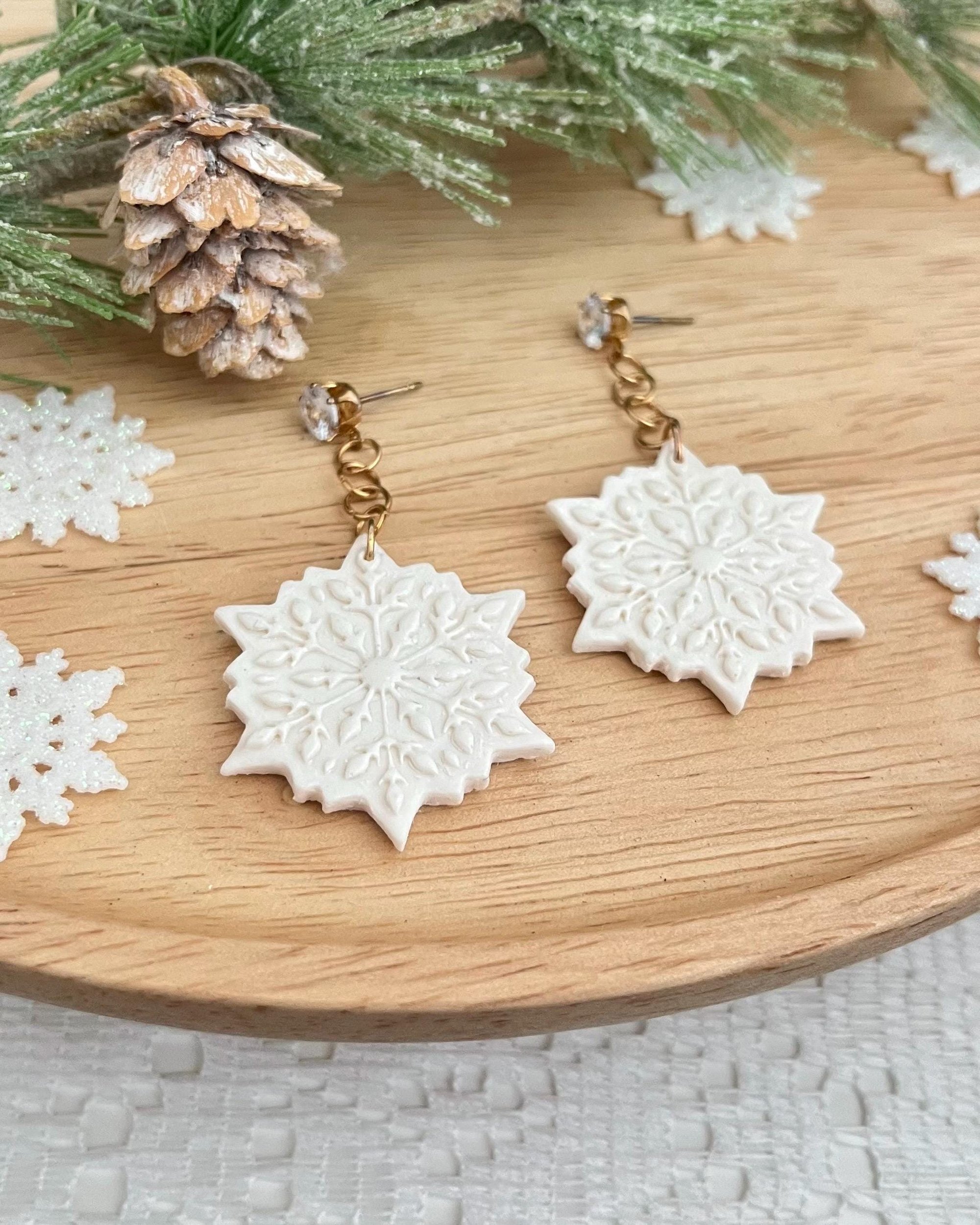 Stunning sparkly snowflake dangle clay earrings, perfect for winter lovers and holiday enthusiasts! These handcrafted earrings shine bright with their intricate snowflake design, adorned with just the right amount of shimmer and sparkle. Made from polymer clay, these earrings are lightweight despit their large size, and comfortable to wear all day long. Whether you're attending a festive party or looking to elevate your everyday style, these earrings are sure to make a statement and add a touch of snowy magic to any outfit.