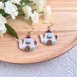 Teapot House Dangly Earrings | Cottagecore Jewelry | Polymer Clay Earring | Whimsical Home | Flow...