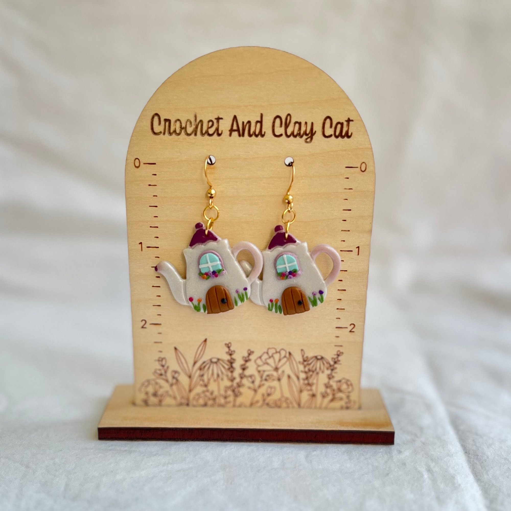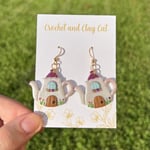 Who doesn't love being snuggled up with a blanket and some tea when it's cozy weather? These teapot house polymer clay earrings are eye-catching statement pieces, that are also elegant and simple.