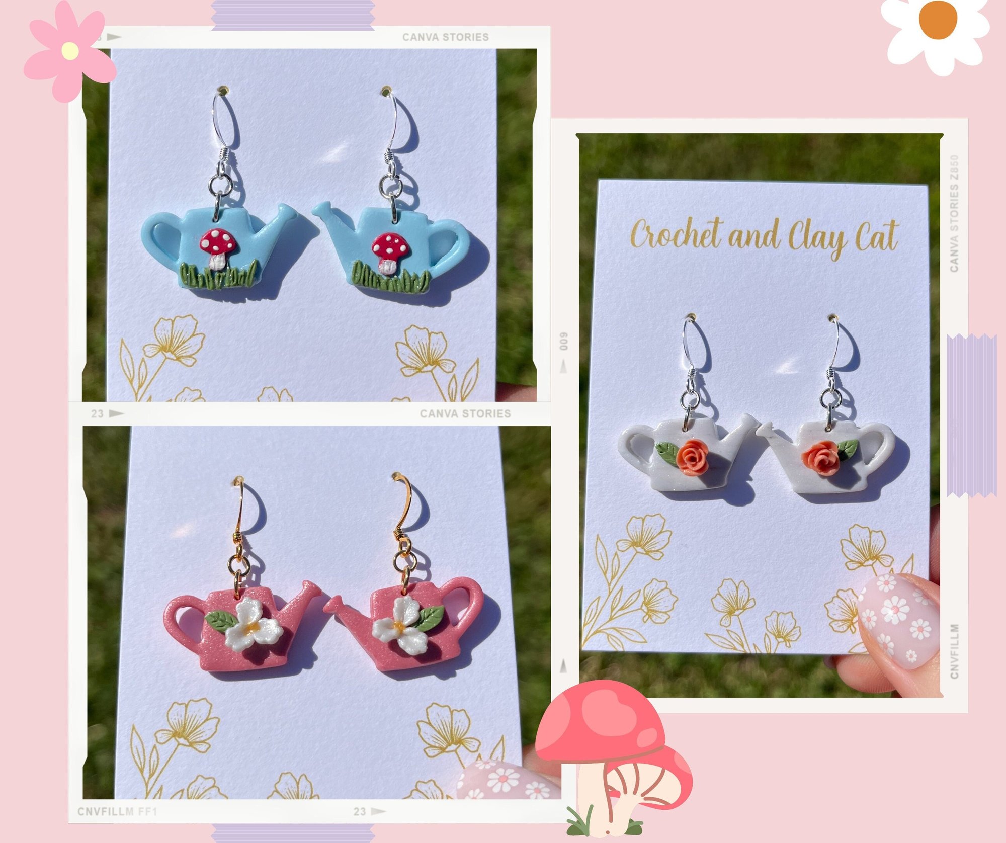 Adorable watering can earrings made with polymer clay and nickel free metals for sensitive ears. These earrings are perfect for a gift!